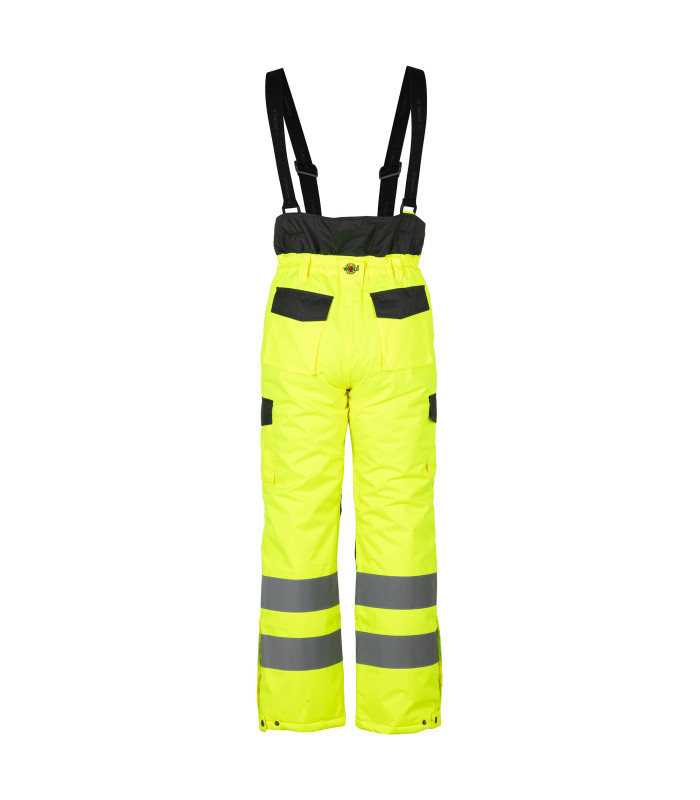 Jardinera térmica HI-VIS Clase 2 certificada, con costuras selladas, tirantes desmontables, multibolsillos, rodilleras, cintas reflectantes y ajuste seguro laboral para trabajos exigentes.