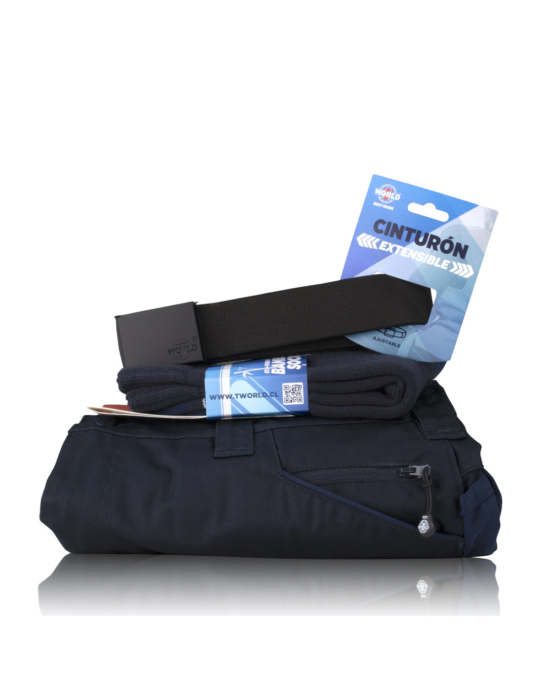 PANTALÓN MAÑIO Pantalón cargo de trabajo Mañío para uso diario, su corte ergonométrico entrega un look moderno y cómodo. Cuenta con presillas anchas y reforzadas para colgar elementos de trabajo. Este diseño fue fabricado con aplicaciones en tela Cordura, un tejido de alta resistencia y durabilidad. CALCETÍN Con tecnología bambú naturalmente antibacterial , amigable con el medio ambiente, y cuenta con absorción de humedad superior. CINTURÓN Cinturón realizado con material elasticado, el cual permite ajustarlo a diferentes talla. Aplicaciones del producto · Industria. · Construcción. · Logística.